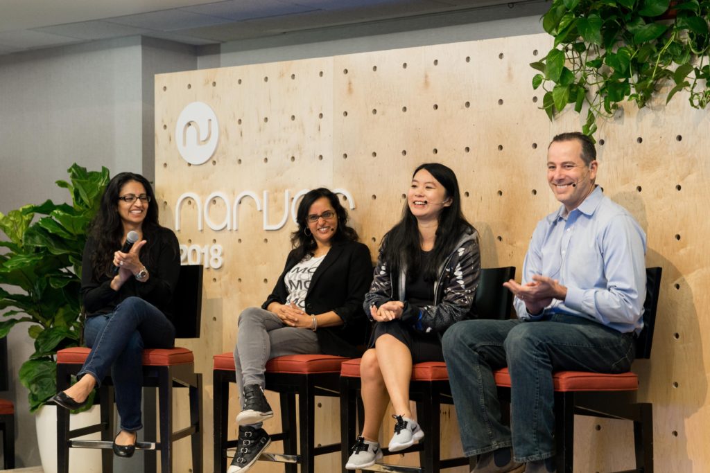 Panel moderator Nisha Ahluwalia with speakers Kakul Srivastava (former VP of Product Mgmt, Github), Michelle Lam (CEO, True & Co.), and Bill Macaitis (former CRO/CMO, Slack)[/caption][caption id="attachment_2027" align="aligncenter" width="1024"]