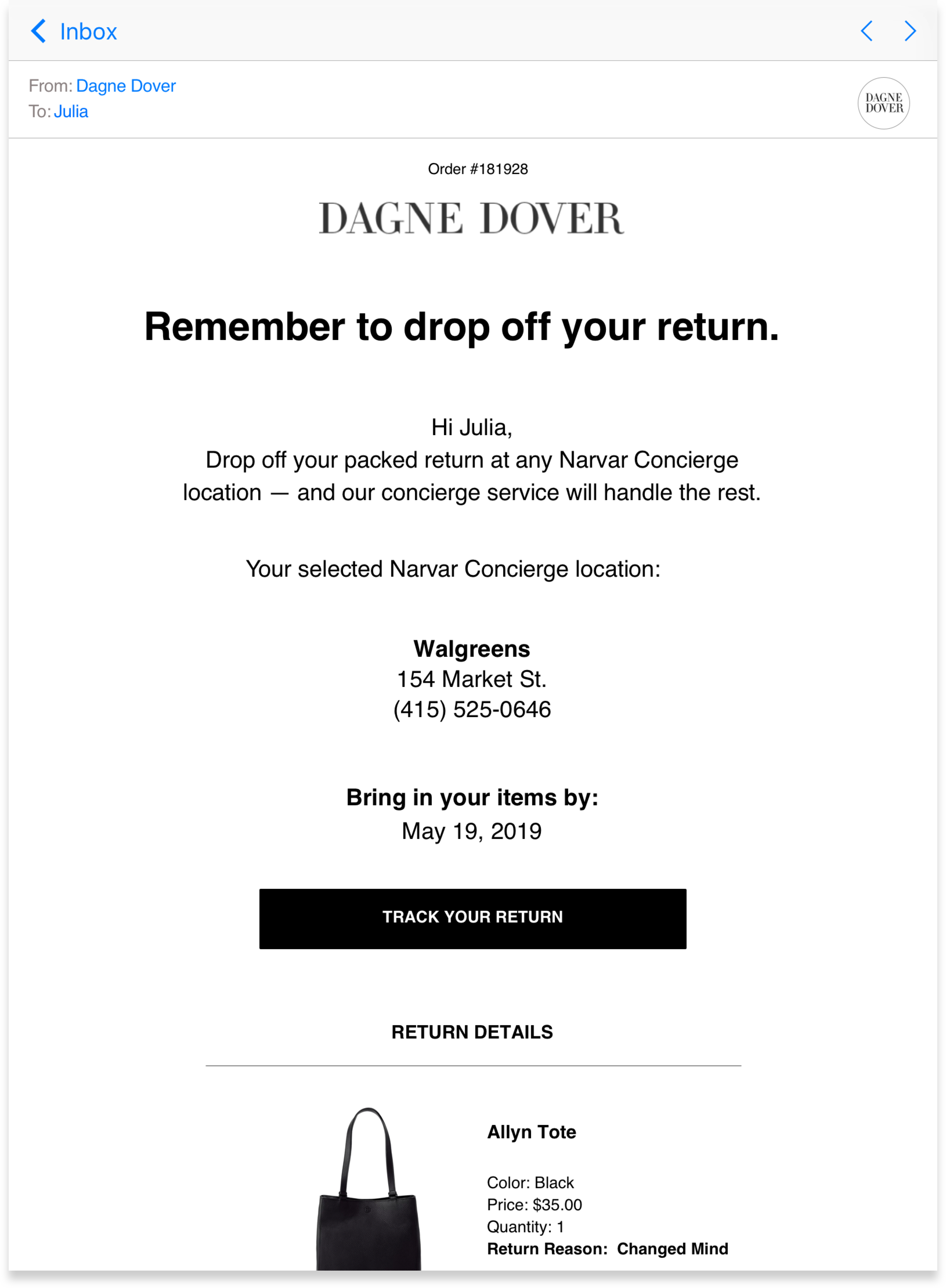 Consumers are prompted to choose delivery to a Narvar Concierge location while shopping online by selecting the order pick-up option during checkout. Consumers can also choose a Narvar Concierge location for returns by selecting the drop-off option in the Narvar return portal. This solution provides consumers with added convenience, flexibility and time savings with minimal changes to your platform.