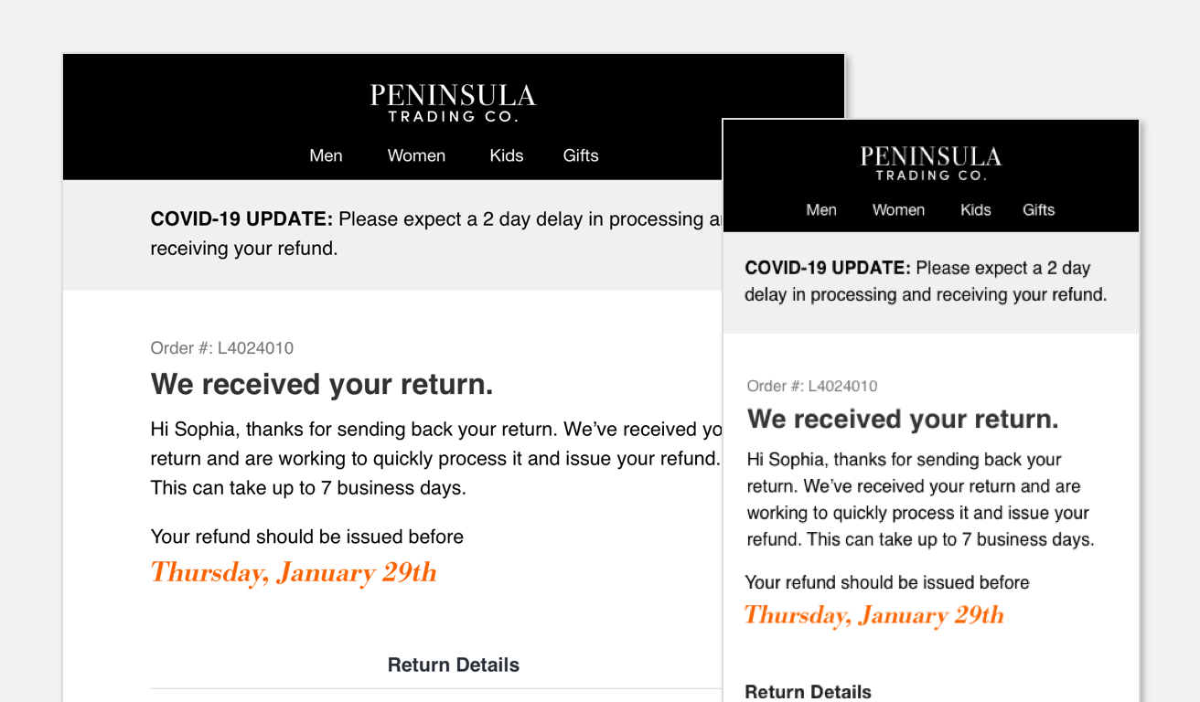 Many retailers are also seeing the time to process a return and issue a refund slow down as they take more precautions at their distribution centers or manage around staffing challenges. To set customer expectations and drive down contact volume, be sure to update your messaging to let customers know of any returns processing delays.