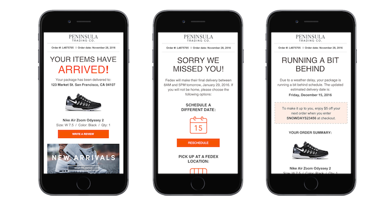 Package delivery is the most exciting part of the post-purchase experience. Imagine a customer in between her daily chores, at the office or running errands. A delivery notification pops up on her phone, letting her know the beautiful wool blend parka she ordered from Nordstrom has arrived. This is the payoff for the trust she placed in the retailer when she made the purchase, and is a perfect opportunity for the retailer to be a herald of good news, as well as to continue to build the relationship. Engagement with such transactional emails is off the charts, commonly getting 4x the open rate and 3x the click through rate of non-transactional emails.