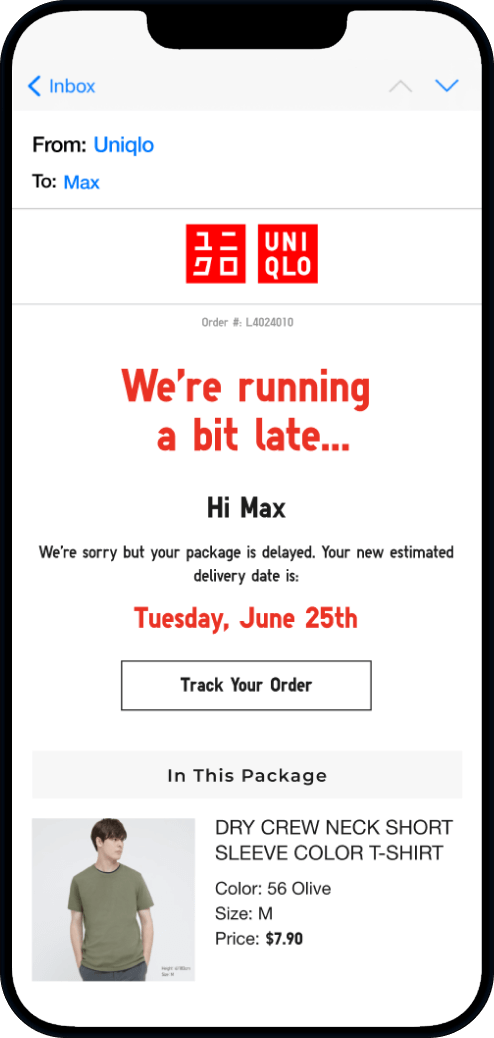 Kunden möchten sofort darüber informiert werden, wenn etwas schiefläuft. Vermeiden Sie Kundenfrust mit proaktiven, rechtzeitigen Updates zum Bestellstatus.