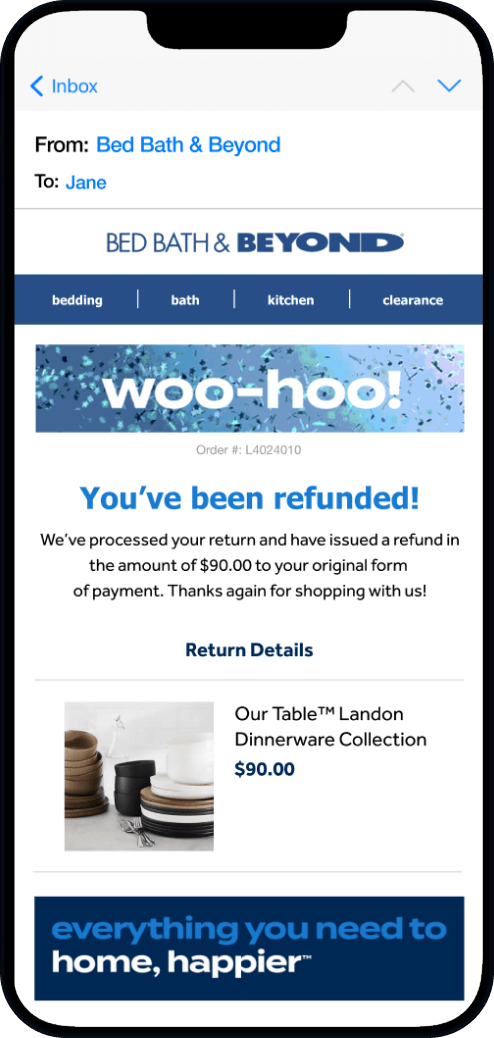 Ein großartiges Retourenerlebnis kann zu einer langfristigen Kundenbeziehung führen. Festigen Sie die Treue Ihrer Kunden mit Rückerstattungsbenachrichtigungen in Echtzeit.