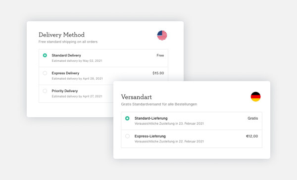 「お客様が選んだ配送方法に応じて、異なるお客様に異なる(お届け予定の)日付を提示することができます。また、お客さまに届くメールは、お客さまの国の言葉で書かれています」