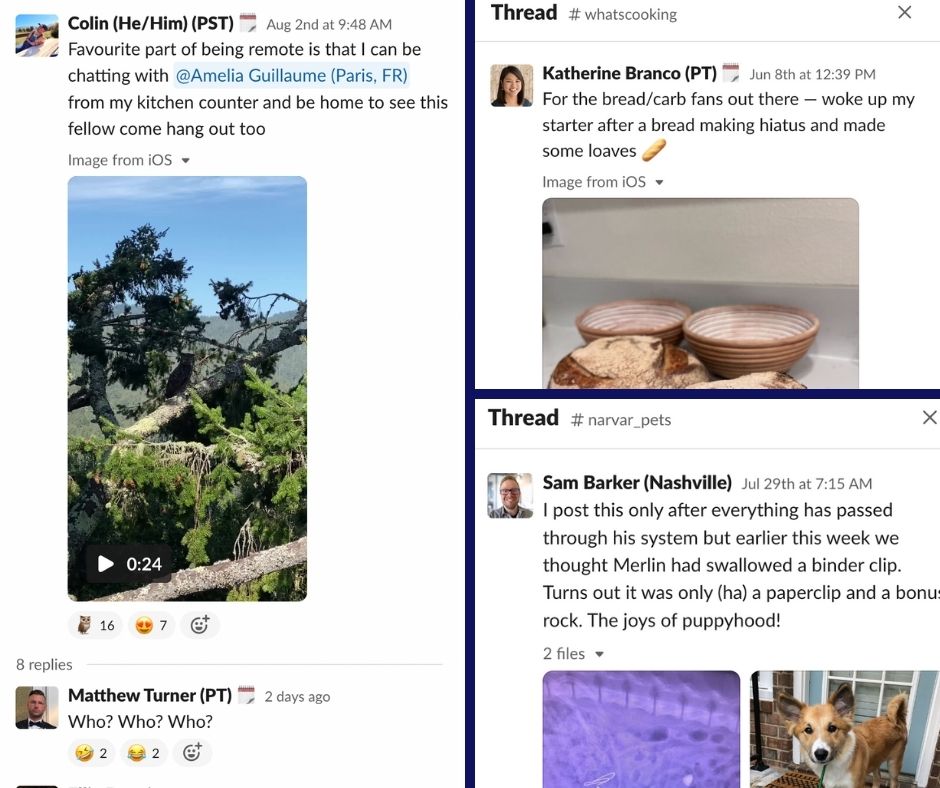Slack is the digital headquarters of Narvar! It’s where we collaborate with teammates and get to know other Narvarians. In addition to team-related and regional channels, Narvarians connect with one another in fun channels such as: