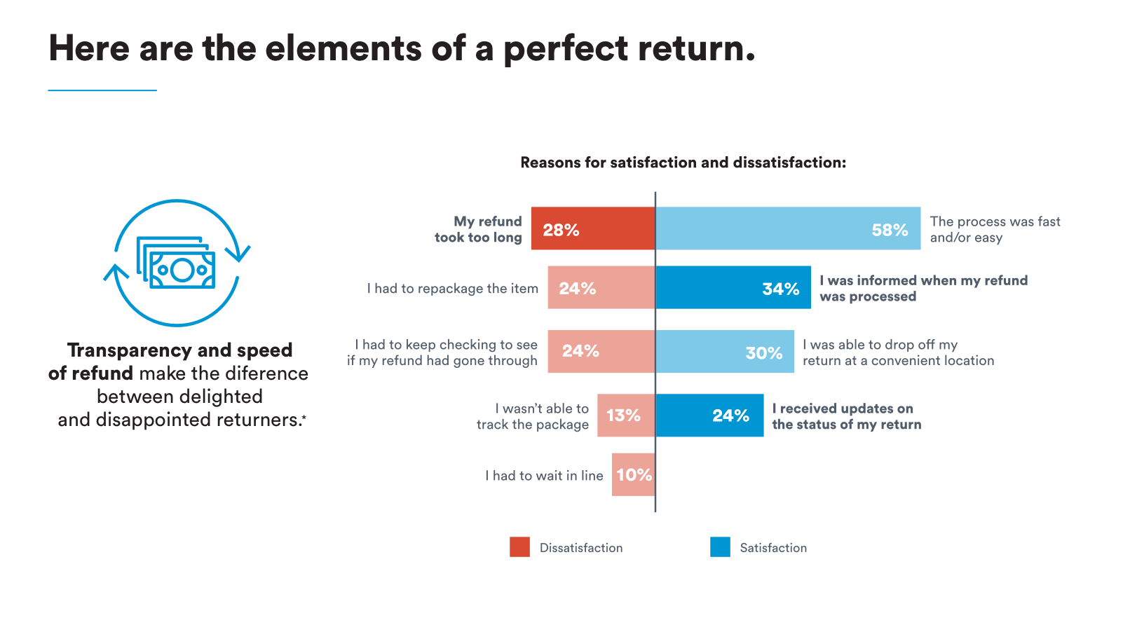 What do customers not like about returns? Consumers were most dissatisfied with paying for shipping, lack of communication regarding return status, and not knowing when they will get their refund. We found that 16% of customers are frustrated with checking the refund status of their return.