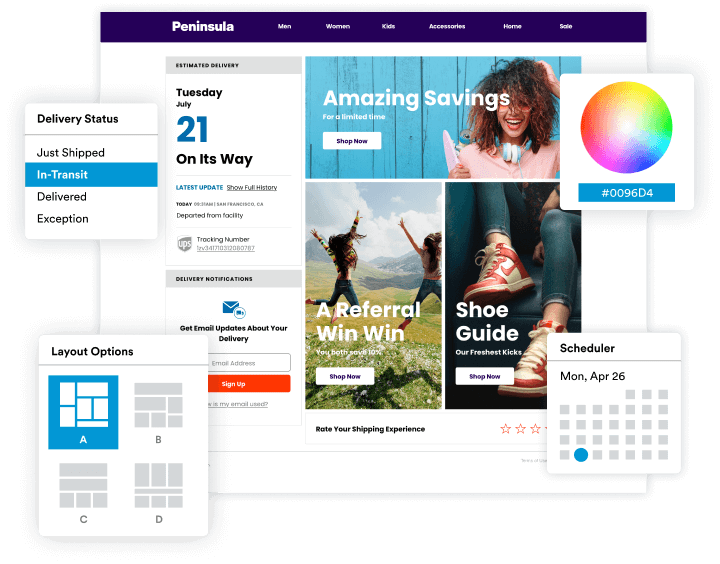 Einmal entwerfen und überall einsetzen. Integrieren Sie jedes Modul der Trackingseite auf Ihrer eigenen Website. Von der voraussichtlichen Lieferzeit über Marketingmaterialien bis hin zu Produktempfehlungen können Sie ein nahtloses Erlebnis schaffen.