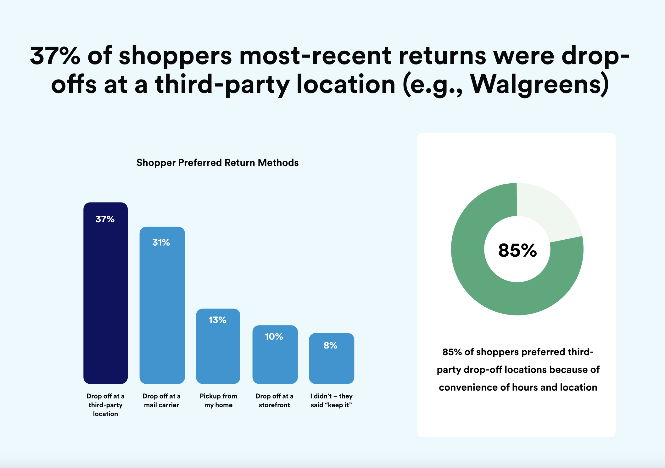 Customers want value, but they also want complete convenience. When it comes to returns, that means retailers need to offer methods that don’t involve re-boxing products, printing return labels, or waiting in line at the post office. Tap into a broad network of return locations as it's the natural next step beyond the traditional third-party carrier return process.